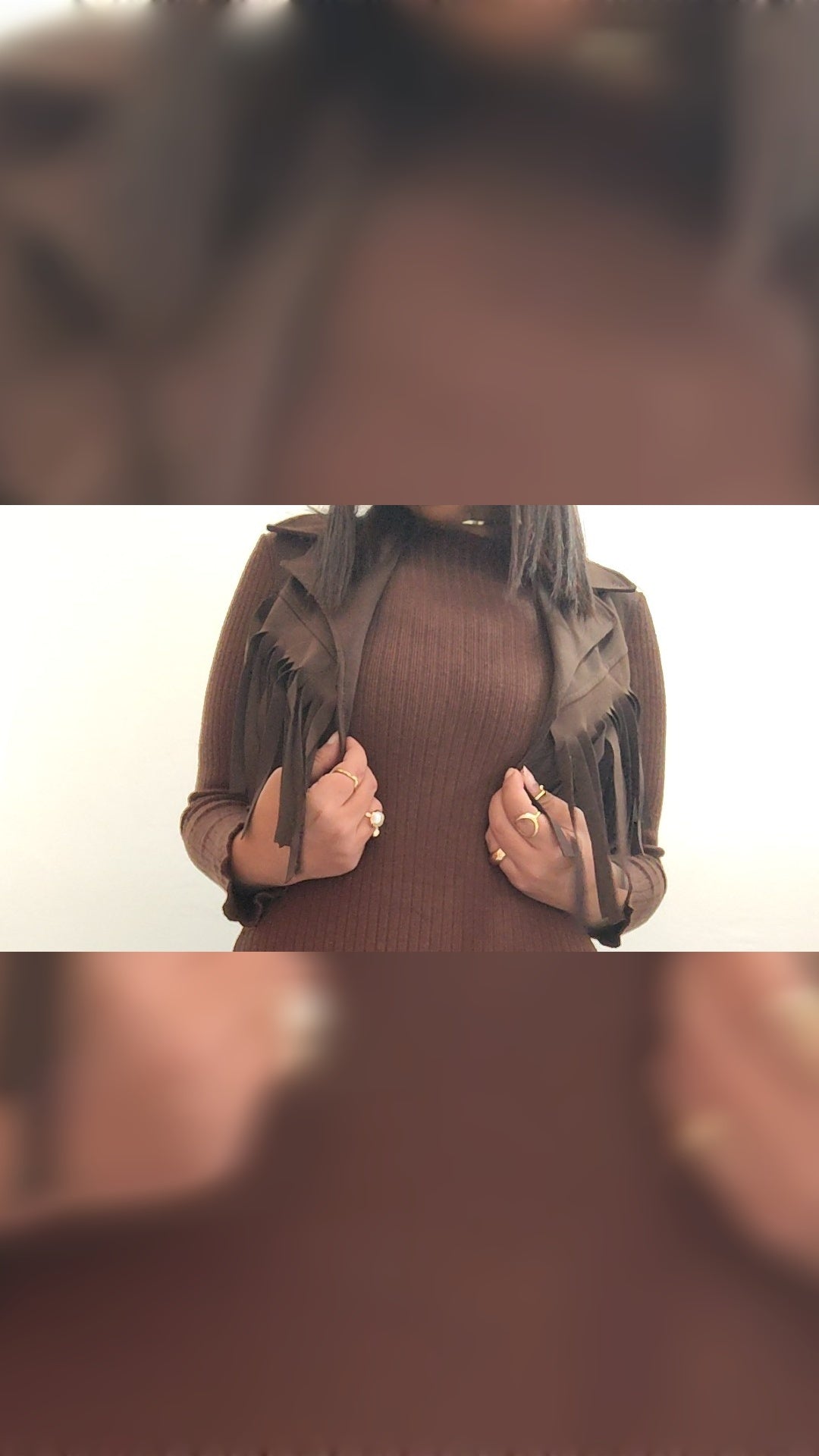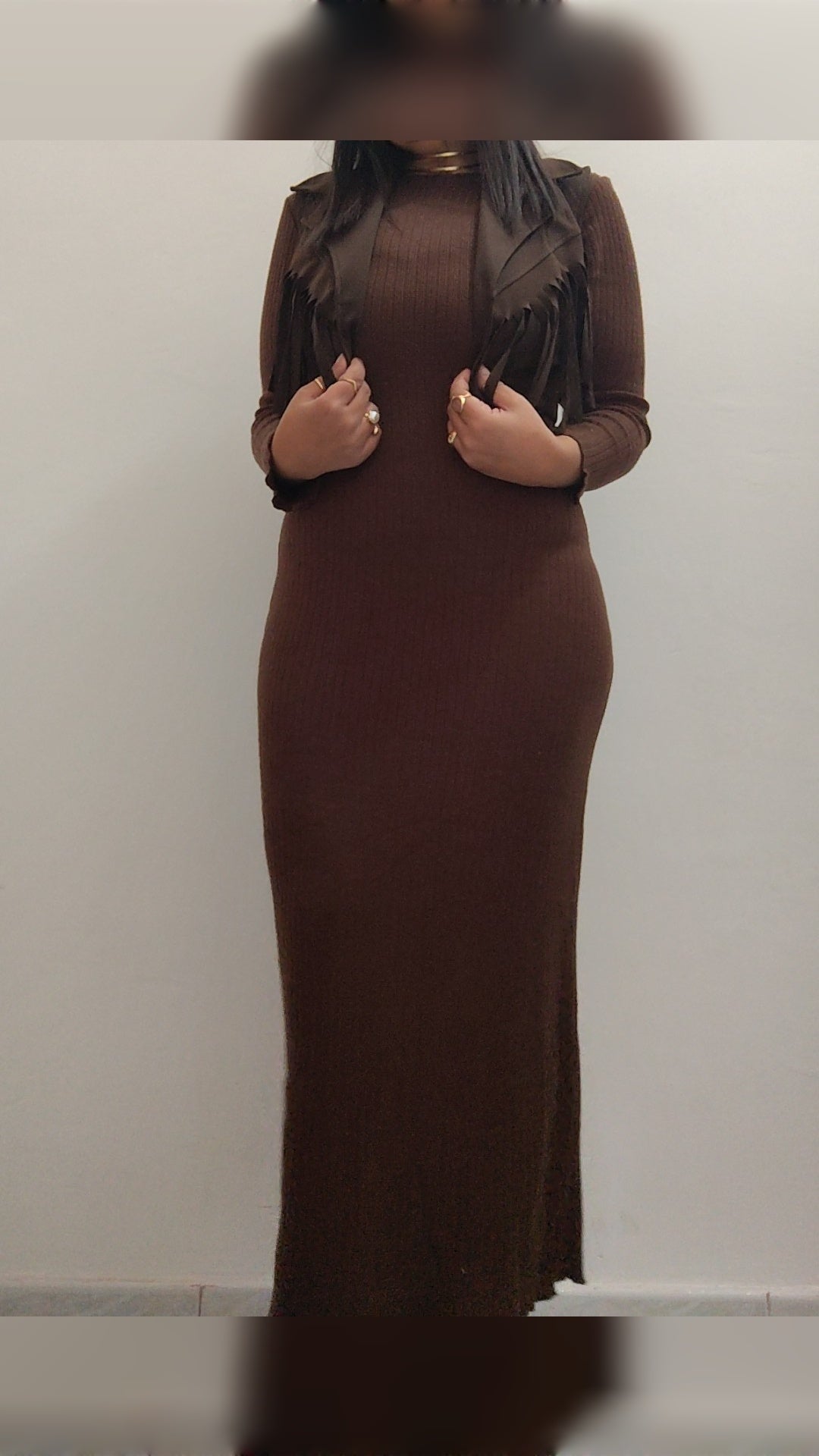 Completo casual composto da vestito lungo e gilet crop con frange, perfetto per look sbarazzini e trendy. Il gilet aggiunge movimento e personalità, mentre il vestito lungo garantisce comodità e stile rilassato. Ideale per giornate informali, passeggiate o outfit street style.