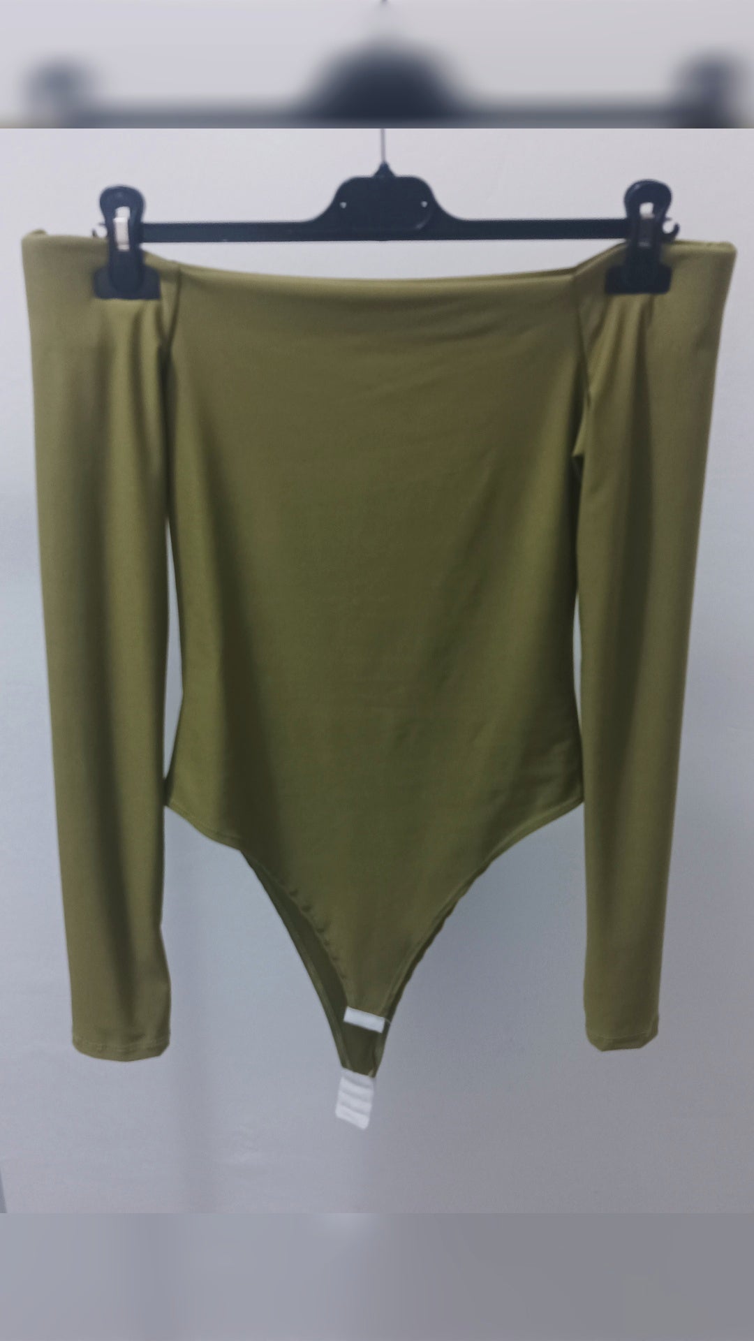 Body con scollo a barca e spalline imbottite, arricchito da manica a guanto. Modello elegante e femminile, perfetto da abbinare a gonne, pantaloni o layering per look sofisticati e di carattere.