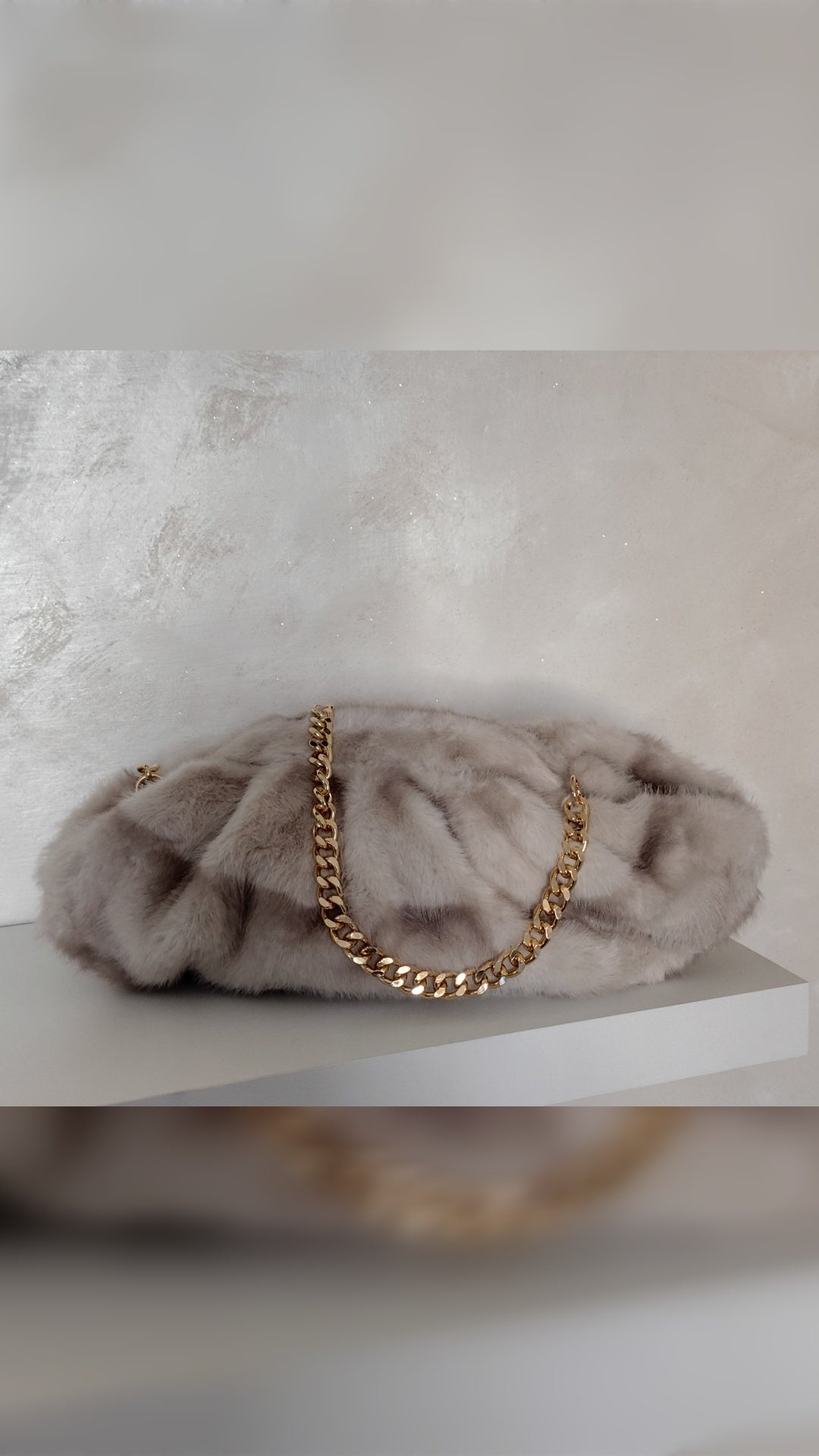 Clutch in eco-pelliccia, morbida e glamour, con catena dorata lunga e chiusura rigida a scatto tipica delle clutch. Perfetta da portare a mano o a tracolla, aggiunge un tocco chic e cruelty-free a qualsiasi outfit serale o casual elegante.