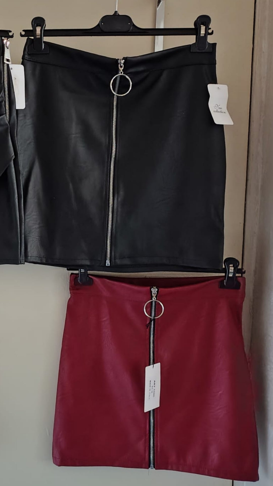 Gonna in ecopelle dal look rock e audace, impreziosita da una cerniera frontale che dona carattere e personalità. Perfetta per creare outfit decisi e grintosi, da abbinare a top, camicie o giacche per uno stile urbano e femminile.